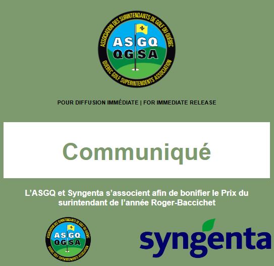 Montréal, QC – février 2026 — L’Association des surintendants de golf du Québec (ASGQ) est fière d’annoncer un nouveau partenariat stratégique avec Syngenta Professional Solutions Canada, visant à bonifier de façon significative le Prix du surintendant de l’année Roger-Baccichet, l’une des plus hautes distinctions de l’industrie du golf au Québec. Dans le cadre de cette entente, Syngenta apportera une valeur ajoutée concrète au prix en soutenant le développement professionnel et le rayonnement national du lauréat. À compter de 2026, et pour une période initiale de trois ans (2026-2028), Syngenta s’engage à offrir au récipiendaire du prix l’inscription, le transport aérien ainsi que l’hébergementafin de lui permettre de participer au Fall Field Day de l’ACSG (CGSA). Le lauréat sera également intégré à un quatuor composé d’autres lauréats du Prix du surintendant de l’année provenant de partout au Canada ainsi que de membres de l’équipe de Syngenta Professional Solutions, lui offrant une occasion unique de développer son réseau professionnel, d’échanger sur les meilleures pratiques et de renforcer les liens au sein de l’industrie à l’échelle nationale. « Le Prix du surintendant de l’année Roger-Baccichet reconnaît l’excellence, le leadership et l’engagement envers la profession, » a déclaré M. Trevor Anderson, président de l’ASGQ. « L’appui de Syngenta rehausse considérablement la portée de ce prix en investissant directement dans la croissance professionnelle et la reconnaissance de nos meilleurs surintendants. Ce partenariat s’inscrit parfaitement dans notre mission de valoriser et de faire progresser la profession au Québec. » Du côté de Syngenta Professional Solutions Canada, ce partenariat reflète un engagement clair envers l’avancement de l’industrie. « C’est un honneur pour Syngenta Professional Solutions Canada de soutenir l’ASGQ et d’ajouter une valeur tangible au Prix du surintendant de l’année, » a affirmé M. Pat Moir, spécialiste en gazon chez Syngenta Professional Solutions Canada. « Les surintendants jouent un rôle essentiel dans le succès et la durabilité des installations de golf. Nous sommes fiers de reconnaître ceux qui se distinguent par leur expertise, leur dévouement et leur leadership, tout en contribuant à leur développement professionnel. » Créé en l’honneur de Roger Baccichet, figure marquante et grand bâtisseur de l’industrie du golf au Québec, le Prix du surintendant de l’année vise à souligner l’excellence professionnelle, l’innovation et l’engagement des membres de l’ASGQ. Les détails concernant le prix et le processus de mise en candidature sont disponibles au www.asgq.org. L’ASGQ et Syngenta se réjouissent de cette collaboration et de son impact positif sur la reconnaissance et l’évolution de la profession de surintendant de golf au Québec. Renseignements pour les médias: Association des surintendants de golf du Québec (ASGQ) Syngenta Professional Solutions Canada